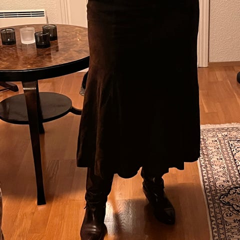 Vähän käytetty mokkanahkainen hame. Vyötärön mitta 88cm, lantio noin 100cm ja pituus 57cm.