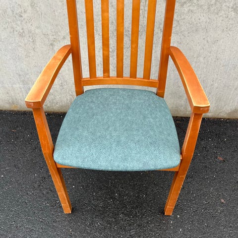 Myydään mäntyinen ruokapöydän tuoli. Päällyskangas rispaantunut ja jaloissa kolhuja.