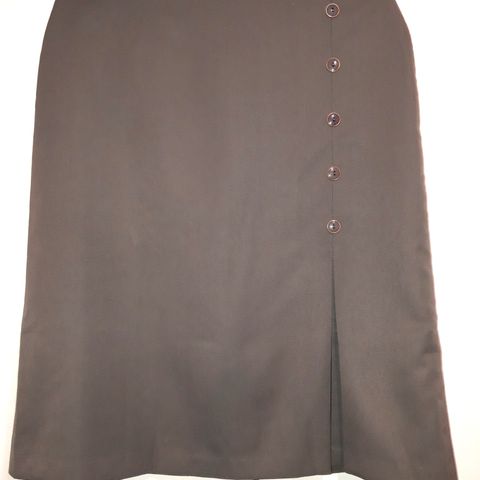 Kangas kevyesti kiiltävää, helppohoitoista trikoota, luultavasti polyesteriä. Kapea vyötärönauha, johon kohdistettu kirjailu. Kiinnitys sivusaumasta vetoketjulla ja nepparilla. Vuoritettu. Erinomaisessa kunnossa.