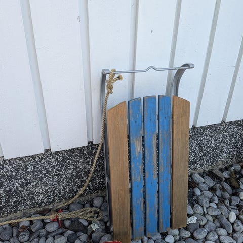 Vanha kelkka mäenlaskuun, kulumaa hieman mutta ikäisekseen hyvässä kunnossa.