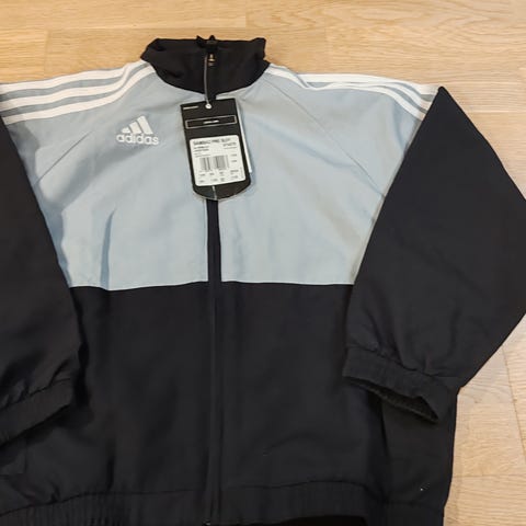 Oikein hyväkuntoiset adidas verkkatakit petroolinsininen koko 116 ja musta koko 128. Selässä lukee Oskar. Mukaan 116cm housut, joissa polvessa reikä.