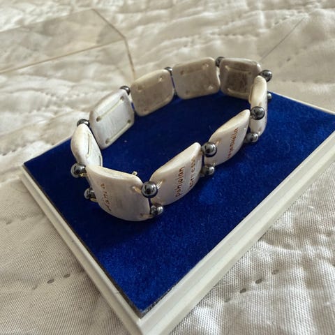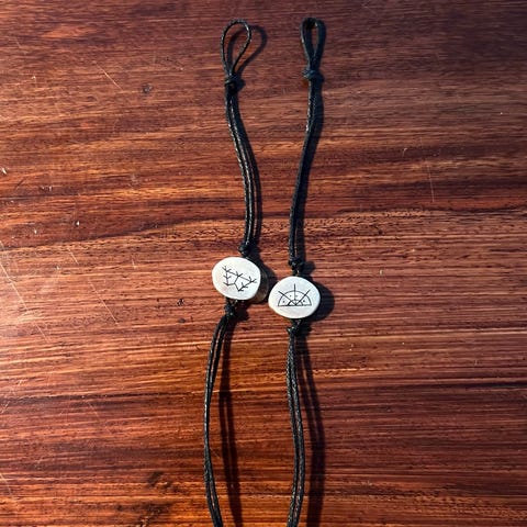 Kotimainen käsintehty nahkarannekoru, jota koristaa tinalankapunos.