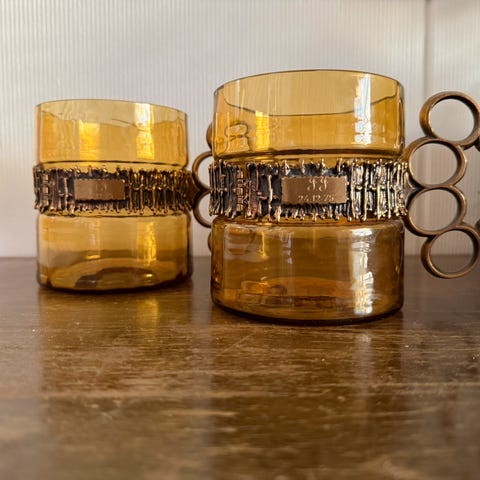 Vintage retro vanha wanha malja booli astia tarjoilukulho tarjoiluastia kulho tarjoilu kauha boolikauha boolimalja kaarna pronssi pronssia signeeraus signeerattu pentti p p. Sarpaneva s 1022 turun hopea kumela meripihka ruskea lasi lasimalja lasikulho sarpanevan