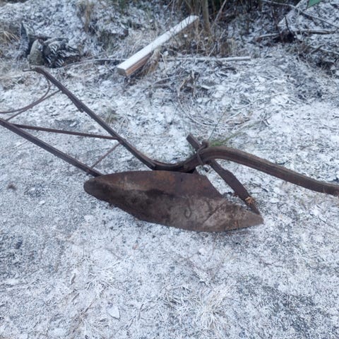 Hyväkuntoinen hevosaura pihakoristeeksi.