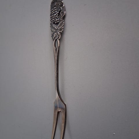 Auran Ruusu-sarjan pikku haarukka, leivoshaarukka, valmistettu hopeasta. Hopea 813. Haarukassa on koristeellinen ruusukuvio varressa. Sopii käytettäväksi cocktailien ja pienten ruokien kanssa. Pituus 12,5 sm.