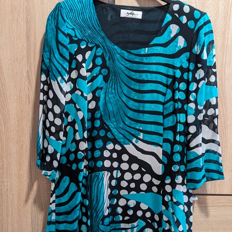 Turkoosi naisten hihaton tunika pusero. Kai/kai 50 cm, koko pituus 82 cm. Viskoosi 75%/polyamidi 25%. Edessä pieni tasku, vetoketju kiinnitys. Kangas ryppypintainen.