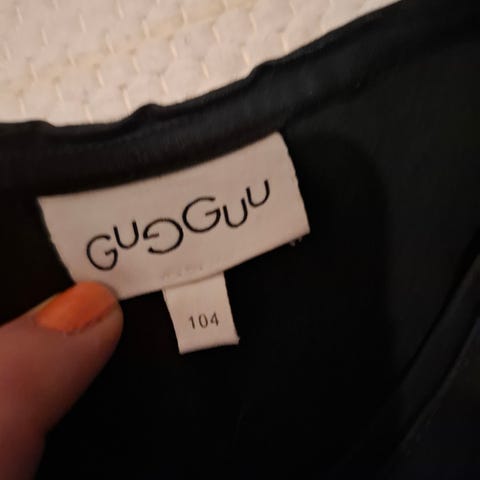 Musta Gugguu paita koko 104cm. Hieman haalistumaa värissä, näkyy etenkin kauluksessa ja saumoissa. Katso kuvat.