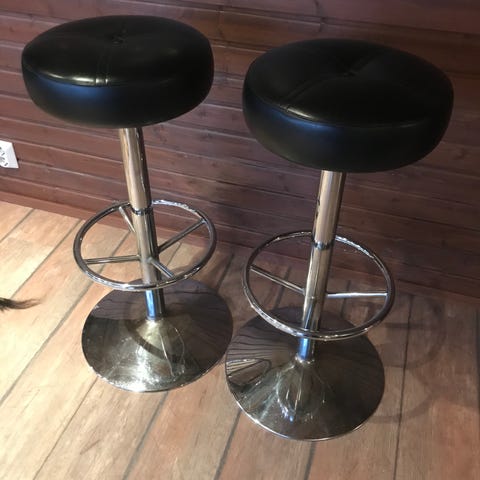 3 kappaletta baarituoleja joissa musta istuin ja krominen jalka. Istuinosassa on kaareva muoto, joka tukee istumista. Tuolissa on jalkatuki ja pyöreä jalusta, joka antaa vakautta. Sopii käytettäväksi esimerkiksi keittiösaarekkeen tai baaritason ääressä.Ja näitähän on 3 kpl tähän hintaan.