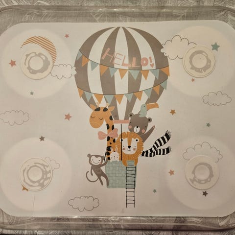 Jo parhaat päivänsä nähnyt Stokke table top alusta. Pinnassa jo naarmua ja kulumaa, osa aluskuvista myös kulunut (katso kuvat). Imukupit hyvässä kunnossa ja napakat eli hoitaa asiansa vielä.