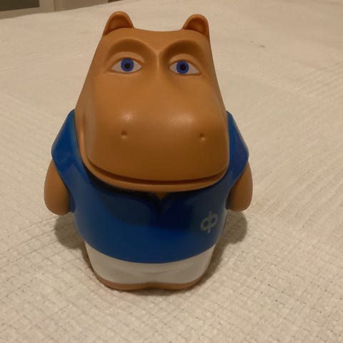 Painava ja rahoja täynnä oleva oranssi Hippo säästölipas.