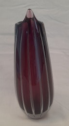 Upea Kumelan noin 60-luvun taidelasimaljakko, signeerattu A. Jacobino Oy Kumela. Täysin ehjä, muutama hienoinen ohuenohut pintanaarmu löytyy tarkasti etsimällä. Väri tumma lila ja kirkas lasi. Korkeus nystyrän yläpäähän 23 cm. Hinta 50€