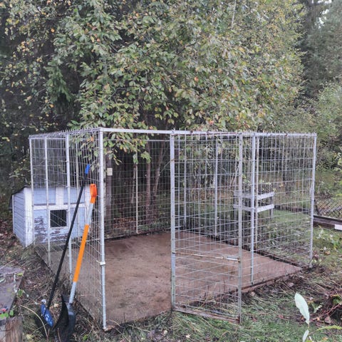 Myydään koiranhäkki ja -koppi. Häkki elementteinä, purettu jo pois paikaltaan. Häkin kaikki sivut 4m pitkiä, korkeus 182 cm.