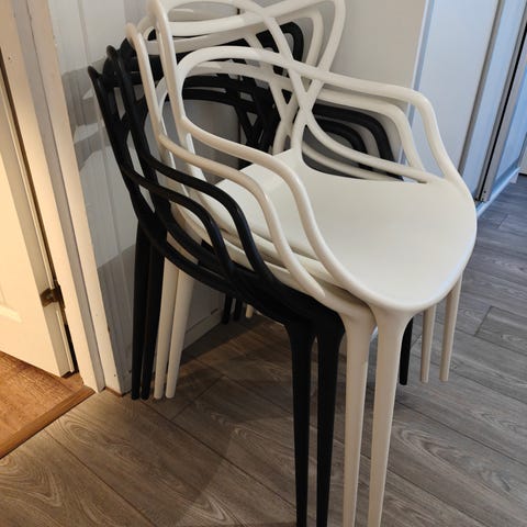 Muovituolit metallirungolla, 2 kpl valkoinen ja 2 kpl harmaa