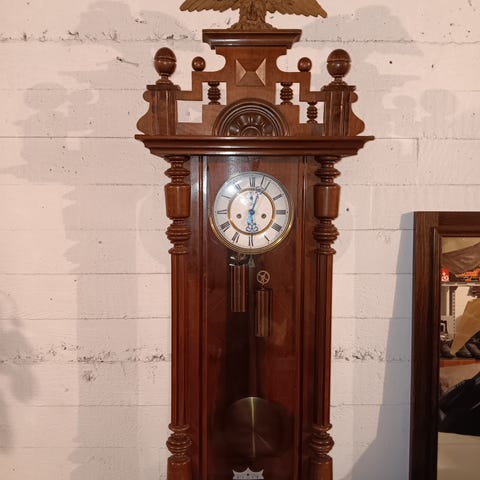 Saksalainen punttikello kuvan mukaisessa kunnossa, käy tarkasti, lyöntivarsi irroitettu mutta voidaan takaisin asentaa jos haluaa, puuttuu joitakin koristenuppeja.