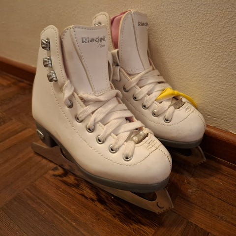 Lucky skatesta uutena ostetut Riedell Olympia junior -taitoluistimet. Koko 6 1/2, narrow lesti. Terät Coronation Ace (10). Pohjallisen mitta 25 cm. Luisteltu kaksi kautta minoreissa ja SM-noviiseissa. Varret tukevat, ei murtumia. Hieman kulumaa/jälkiä kengän kärjissä. Kantapään kohdalla, jalkaterän sisäsivulla, molemmissa kengissä pienet muotoilut sisävuoressa (antaa hieman lisätilaa kantapäälle). Terissä on vielä muutaman kerran teroitusvaraa.