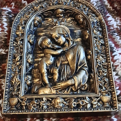 Toisen puolesta myyntiin kaunis seinäkoriste jossa Jeesus illallisella opetuslasten kanssa. Pohja puuta, kuvio-osuus vaikuttaisi olevan jotain muotoiltavaa ainetta, kipsiä tms joka pinnoitettu. Yhden henkilön päästä puuttuu pinnoite. Kulmissa lasitetut kolot joissa jotain sisällä. Alla teksti: God bless our home. Koko noin 15x26cm.