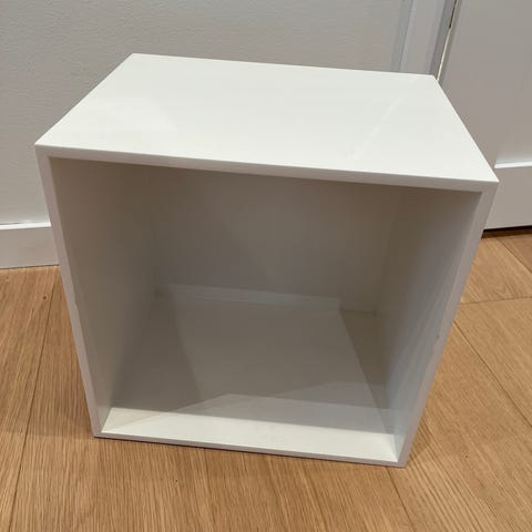 Myydään valkoisia Muuto Stacked -hyllymoduuleja ja Muuton tammijalusta