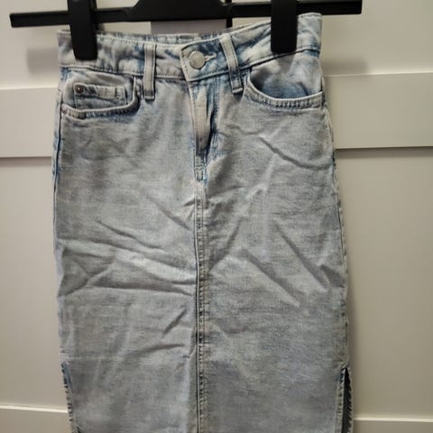 Tosi siisti sininen farkkumaista kangasta oleva hame, kevyt. Koko 128cm. Taskut, vetoketju ja nappi. Myös kuminauhakiinnitys, eli sopii monen kokoiselle.