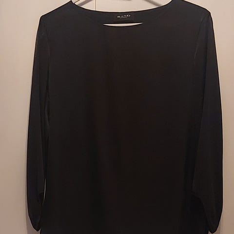 Tyylikäs silkkipusero, pitkät hihat ja yksi nappi kummassakin hihassa. väri on maitovalkoinen. Materiaali: 93% silkkiä, 7% elastaania. Koko S, puseron pituus 60 cm, hihan pituus 57 cm. Kai- kai 49 cm.