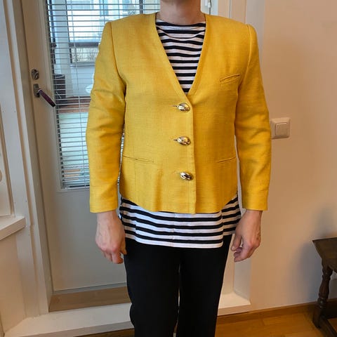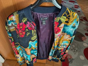 Silkkijakku silkkivuorilla Koko 40-42 vetoketjutaskut ja vetoketjuavaus erikoinen tyylikäs kuvio voin tuoda tai postittaa eri sopimuksesta