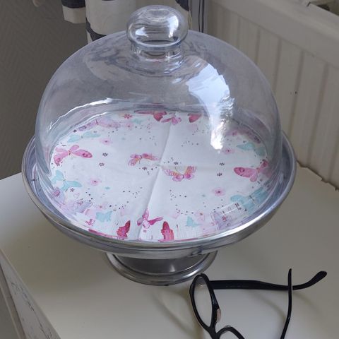 Transparent sininen lasivati. Korkeus 18 cm ja halkaisija sakaran kärjestä kärkeen 44 cm. Esine on täysin ehjä.