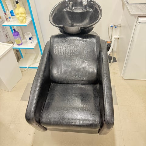 Kampaamon hiustenleikkuutuoli GREINER, jalalla korkeus pumpattava. NUBETT . Hiustenpesupenkki, tuolissa kulumareikä selkänojassa. 150/kpl