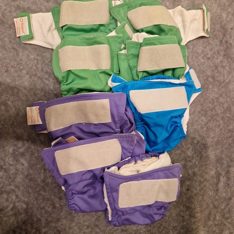 4 kestovaippaa, joihin 6 imua mukaan. Oranssin ja valkoisen tarrat tosi hyvät, mutta violeteissa vähän heikommat. Pesty hajusteettomalla.