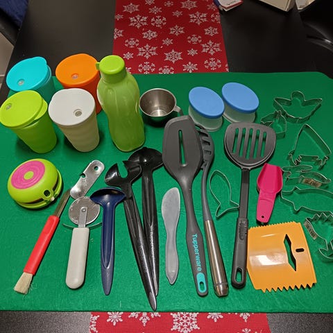 Ns. Minuutti Mikko. Kuvassa näkyy osat. Silppuaa, sekoittaa ja kuivaa salaatin. Pieni käsin veivattava. Nouto.