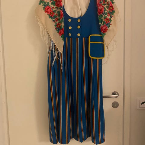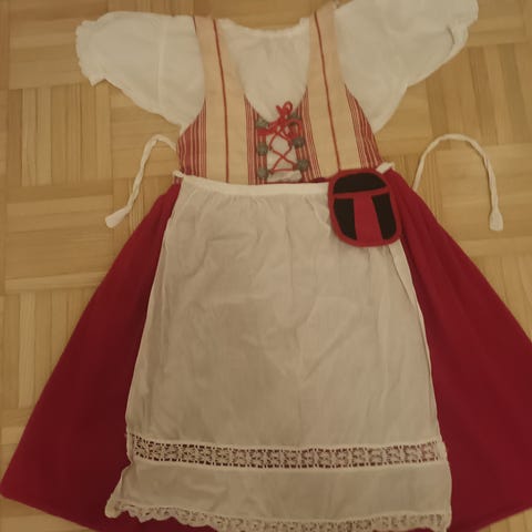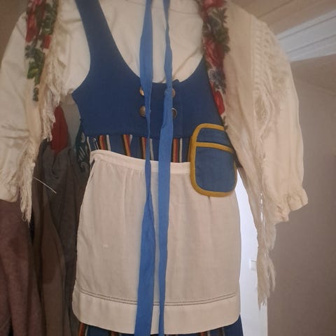 Helmi Vuorelman kansallispuku, pukuun kuuluu essu, puuvillapaita ja hame. Hameen kokonaispituus 112 cm. Vyötärön ympärys 72 cm. Vähän käytetty, hyvä kunto. Vuorelman kokotaulukon mukaan sopii n. 152 cm kokoiselle. Teetetty uusi paita, vanha paita myös mukaan. Voin postittaa, ei lemmikkejä, ei tupakointia.