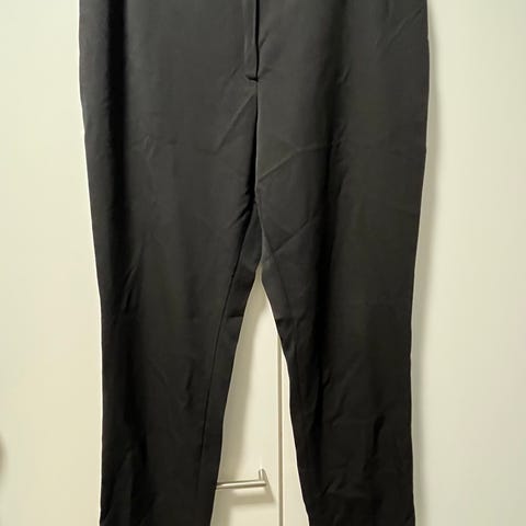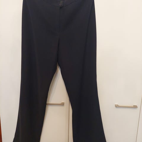 Siistit housut juhlaan tai arkeen. Rypistymättömät ja laskeutuvat kauniisti. Leveät puntit hoikentavat ja ovat mukavat päällä. Jääneet vähäiselle käytölle. Edessä napit ja vetoketju, vyönlenkit. Vyötärö 2x48 cm, vyö-lahkeensuu 111 cm. (Ostettu Sokokselta ovh. 100 e).
