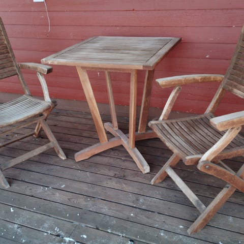 Portaaton selkä- ja jalkanojansäätö kaikissa tuoleissa. Ruokapöytä säädettävä eli myös kahvipöytä korkeuteen. Uuttavastaavat. Liian isot meidän parvekkeelle.