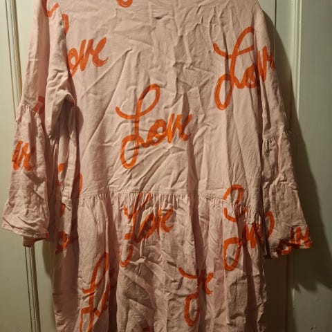 Vimman ihana oranssi-pinkki onesize mekko tai tunika. Tulee itselläni (165cm) hieman polvien yläpuolelle, ihana myös vaikka farkkujen kanssa. Materiaali 95% luomupuuvillaa, 5% elastaania. En löydä moitteita kunnossa.