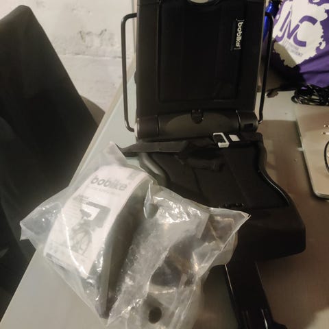 Bromptonin etusarviin kiinnitettävä lastenistuin adapterilla ja tuulilasilla. Tuulilasin kiinnike hieman rikki, pysyy silti paikallaan, mutta ei ole ollut meillä käytössä, joten pysyvyydestä ei takuita. Käsistään kätevä saa helposti korjattua siitä pysyvän. Keränyt pölyä varastossa, nyt uusille omistajille. Lähettäminen saattaa olla hankalaa tahi kallista.