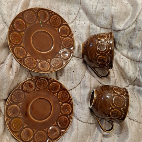 Englantilaiset Tams kahvikupit lautasineen.