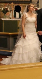 Myydään kaunis puolimerenneito-mallinen ja ivory-värinen hääpuku. Puku on kokoa S/36, mutta nyörityksen ansiosta liikkumavaraa on molempiin suuntiin. Puku on yksiolkaiminen, mutta sen saa myös olkaimettomaksi. Kauniita kukka-yksityiskohtia löytyy yksi puvun sivuosasta sekä kukallinen olkain. Puvussa on pieni laahus ja sille laahuslenkki. Oma pituuteni on 162cm ja korot 6cm, mutta menee hyvin pidemmällekin morsiamelle. Puku on pesetetty ja mukana tulee pukupussi.