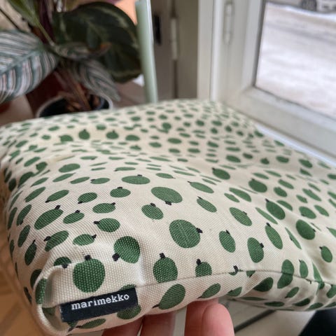 Kaksi Marimekko-kankaalla päällystettyä istuintyynyä