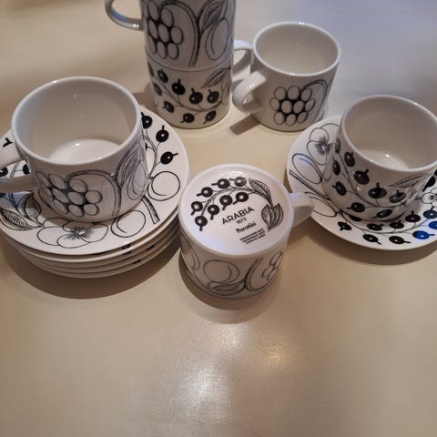Myytävänä uutta vastaavassa kunnossa oleva kuvan musta-valkoinen Arabian Paratiisi kahviastiasto 8:lle henkilölle. Lisäksi varalautasia ja kuppeja.
