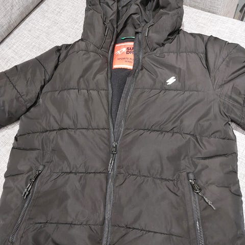 Superdryn pitkähkö musta takki. Sopii kevät/syyskauteen. Tuplavetoketju edessä. Hupun saa käärittyä piiloon.