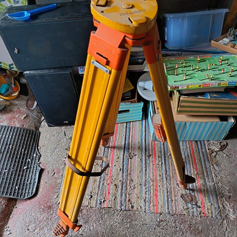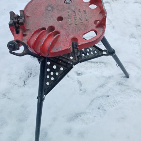 Säädettävä Kolmijalka. Kuvissa mitat/koko. Laadukas ja todella tukeva. Säätö tapahtuu veivistä.