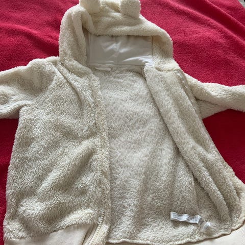 Vaaleanpunainen kevyt villatakki tms. Ei kokolappua mutta ollut käytössä n. koossa 140. On ehkä itse tehty tms kun ei lappuja, tai en ainakaan löytänyt.