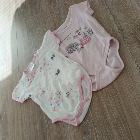 Valkoinen suloinen body, hyvässä kunnossa. En löytänyt moitetta. Kissatalous ja hajusteeton pesu.