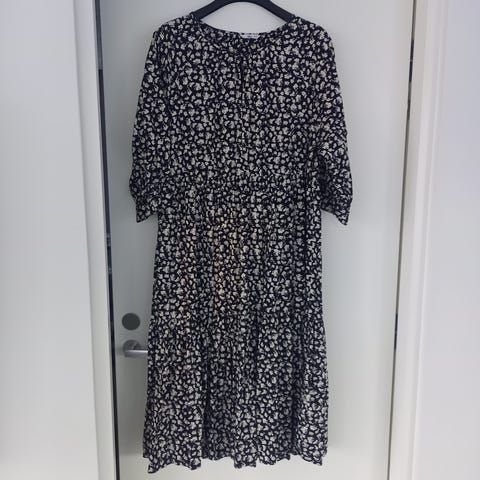 Pitkä puuvillamekko, jossa kokopitkä, taskullinen, sininen "alusmekko" ja yläosassa värikäs, abstrakti tunika; kokonaispituus 130 cm, leveys olkasaumoista 41 cm, kainaloiden kohdalta 55 cm ja helmasta 70 cm. Sopii hyvin juhlamekoksikin. Ollut kerran päällä. Kuvassa värit näyttävät vaaleammilta kuin luonnossa.