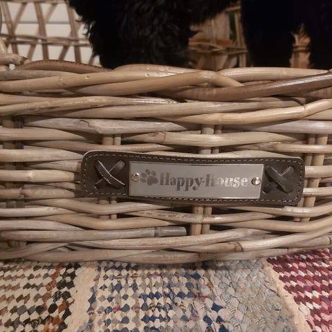 Punottu, soikion muotoinen, siisti kori lemmikille. Mitat 70 x 50 cm, korkeus 20 cm.