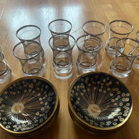 Hakusanat: arabia keramiikka arabian design kuppi muki kupit lautanen astiasto kahviastiasto tassi asetti lautaset kupit mukit sisustus kultapiisku lautanen vintage retro hopea hopeinen astiat