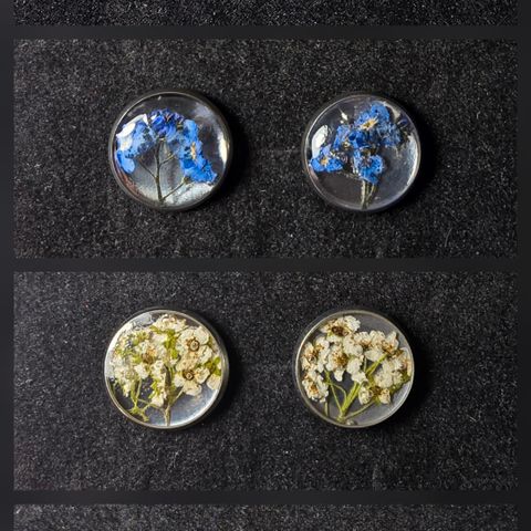 Myydään upeat käsintehtyt hartsi-kukka korvakorut. Materiaali hartsi, korvakorun koukku hopeaa 925, metallilanka/metallirenkaan ovat hopeoituja. Käytetty luonnonkiviä kts. luettelo alhaalla. Yksi vaihtoehto ilman kiviä, kirkas hartsi. Korvakorun konaispituus n. 3.5 cm. Uniikki design. Lahja/säilytyspussi ja silikoonitulpat tulevat mukaan. Katso myös muita tekemäni käsityötuotteita.