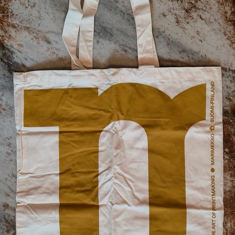 Marimekon Muija - kangaskassi, musta-valkoinen, koko 43x46cm. Katso myös muut Marimekon kassi-ilmoitukseni (viim kuva, Vihkiruusu on MYYTY) .
