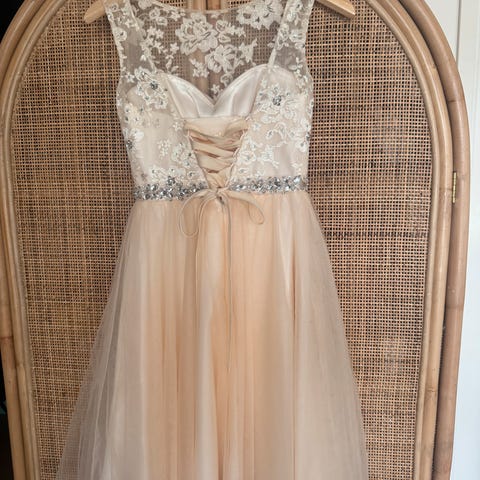 Sininen naisten mekko, koko 42. Mekossa on pitsikoristelu yläosassa ja hihaton malli. Materiaali on kevyt ja läpikuultava alaosasta, sopiva juhla- tai rippimekoksi. Pesulapuhdas