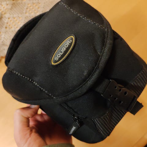 Pieni kameralaukku esim. kompaktikameralle tai pienelle järjestelmäkameralle. Laukku on ulkoisesti hyväkuntoinen, hiukan kulahtanut värillisistä kohdista. Hihnaa ei ole, voi kuitenkin ostaa itse jonkinlaisen tai käyttää kameran suojaamiseen esim. repussa.