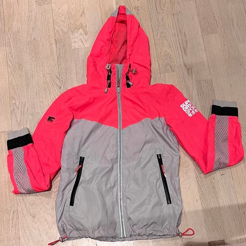 Turkoosi Superdry merkkinen tuulitakki. Koko S. Jostain kohdissa edessä ja takana merkki lähtee hieman repsottamaan.