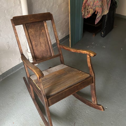 Uniikki emännäntuoli jo hieman elämää ja koiranpennun hampaita nähneenä. Istuinosa avattavissa ja lukittavissa.